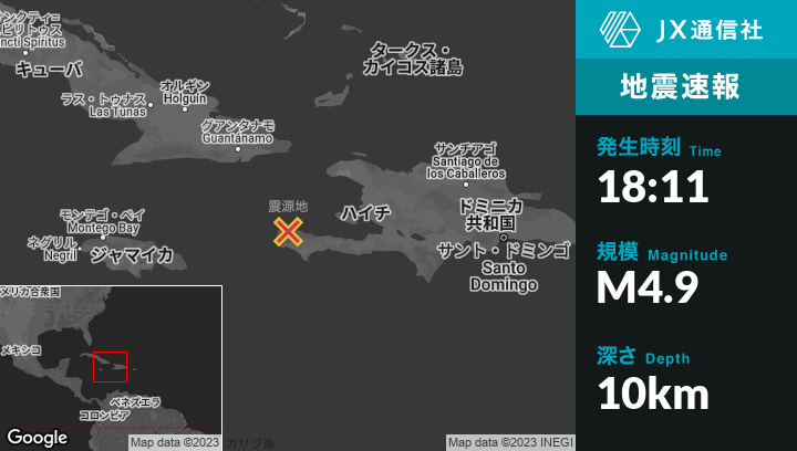 6月06日 18:11頃、ハイチのLes Abricotsから北東9kmの地点でM4.9の地震がありました。