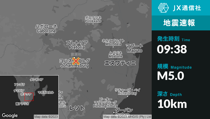 | 震源地 | 南アフリカのAlbertonから南南東6kmの地点 |
