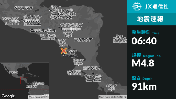6月15日 06:40頃、ニカラグアのVilla El Carmenから西北西30kmの地点でM4.8の地震がありました。
