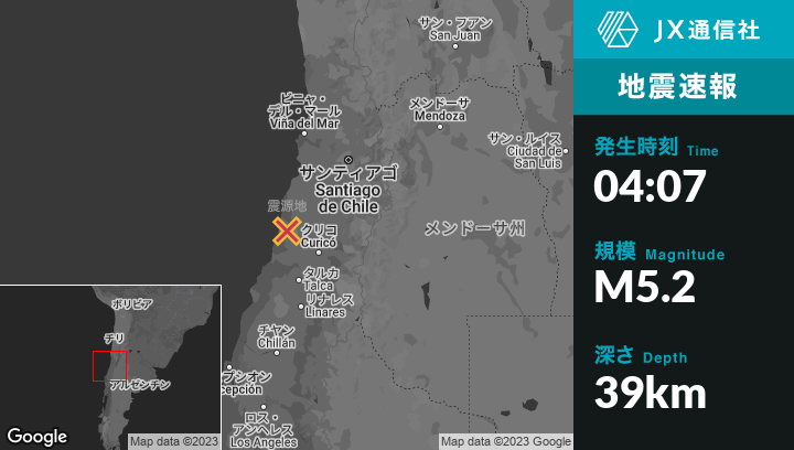 6月16日 04:07頃、チリのSanta Cruzから西北西49kmの地点でM5.2の地震がありました。