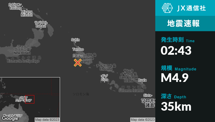 | 震源地 | パプアニューギニアのPangunaから西南西74kmの地点 |