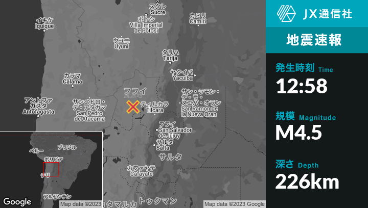 6月18日 12:58頃、アルゼンチンのEl Aguilarから西66kmの地点でM4.5の地震がありました。