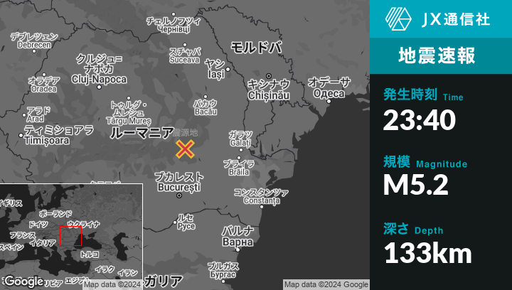 9月16日 23:40頃、ルーマニアのCașocaから北6kmの地点でM5.2の地震がありました。