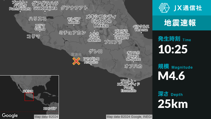 11月01日 10:25頃、メキシコのPapanoaから南南東8kmの地点でM4.6の地震がありました。