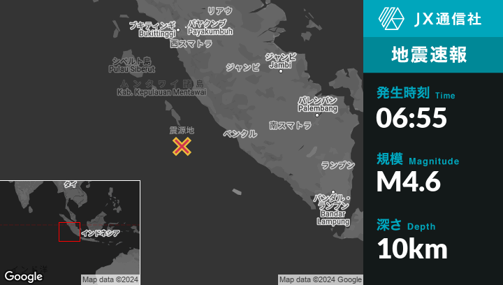 | 震源地 | インドネシアのBengkuluから西195kmの地点 |