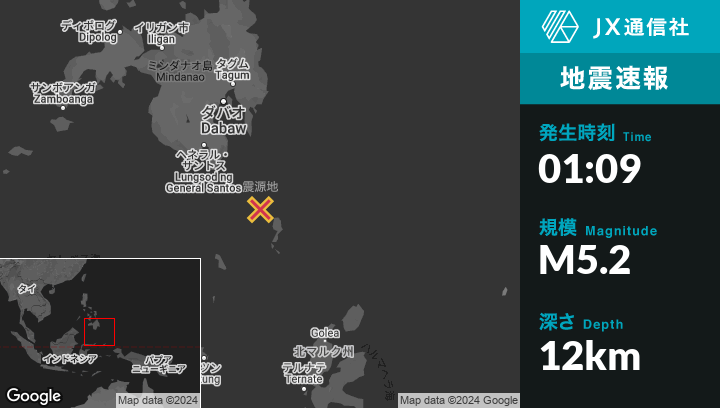 12月04日 01:09頃、フィリピンのSaranganiから東南東123kmの地点でM5.2の地震がありました。