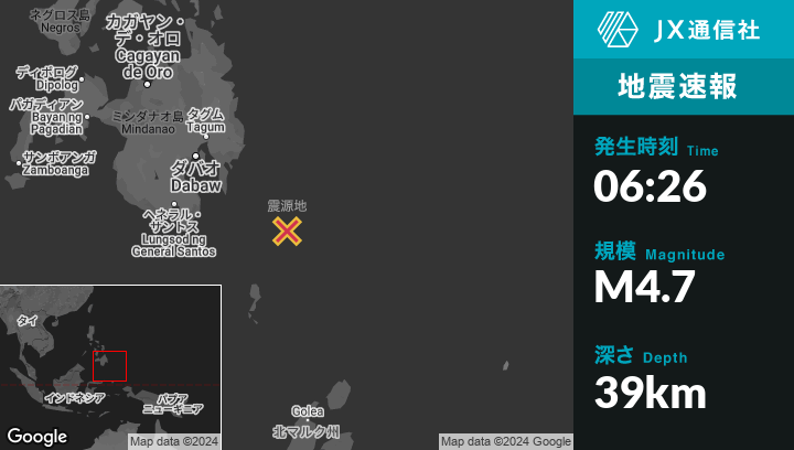 | 震源地 | フィリピンのPondaguitanから東南東155kmの地点 |