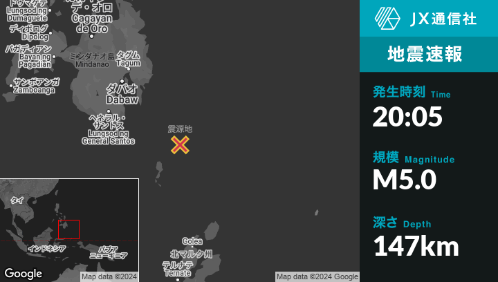 | 震源地 | フィリピンのPondaguitanから南東190kmの地点 |