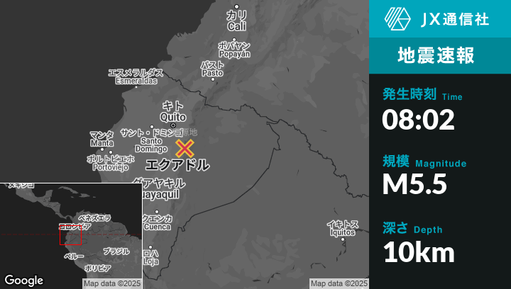 2月01日 08:02頃、エクアドルのArchidonaから西北西39kmの地点でM5.5の地震がありました。