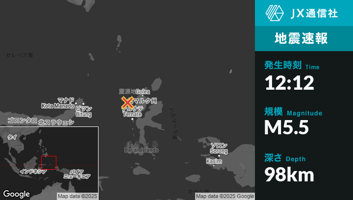 2月05日 12:12頃、インドネシアのTernateから北北西96kmの地点でM5.5の地震がありました。