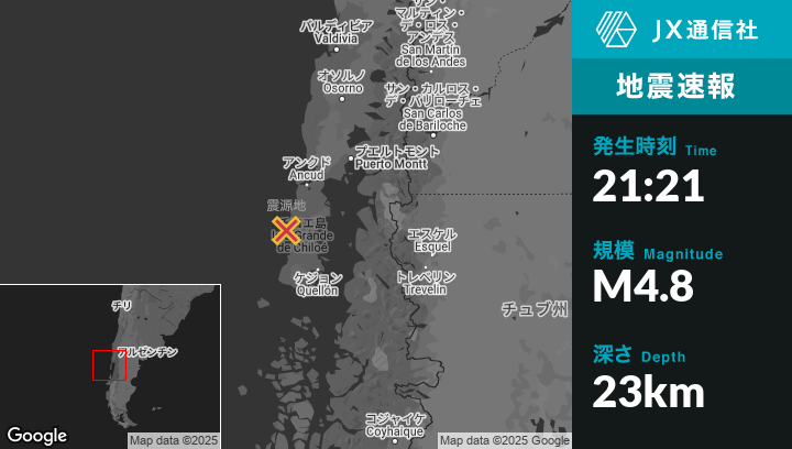 2月06日 21:21頃、チリのCastroから西38kmの地点でM4.8の地震がありました。