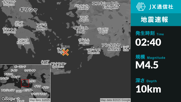 2月12日 02:40頃、ギリシャのAmorgósから南南西24kmの地点でM4.5の地震がありました。