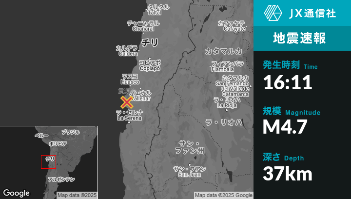 2月13日 16:11頃、チリのVallenarから南西75kmの地点でM4.7の地震がありました。