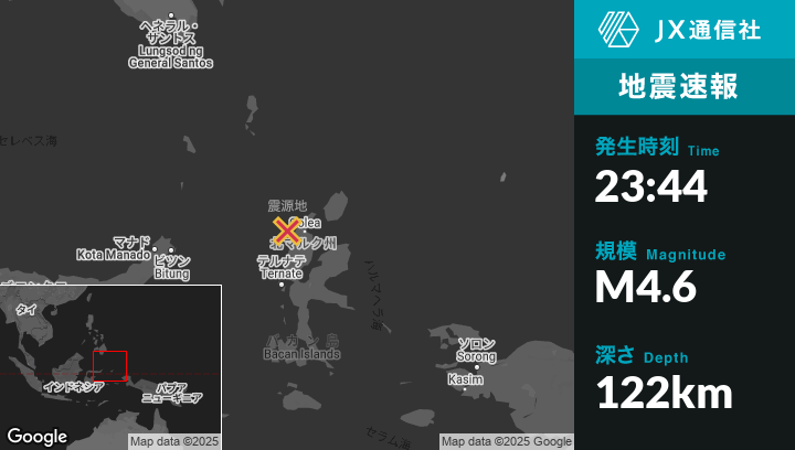 | 震源地 | インドネシアのTobeloから西北西63kmの地点 |