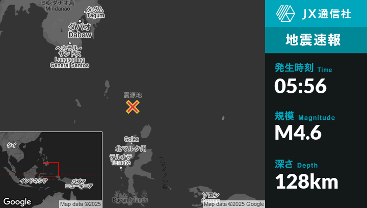 | 震源地 | インドネシアのTobeloから北196kmの地点 |