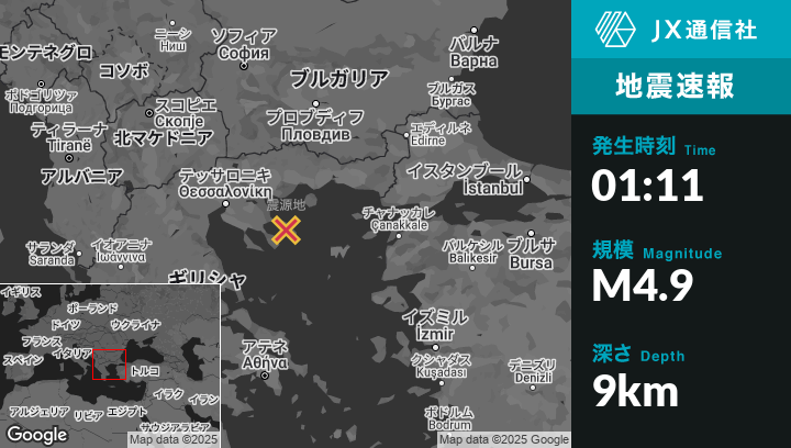 | 震源地 | ギリシャのKaryesから北西11kmの地点 |
