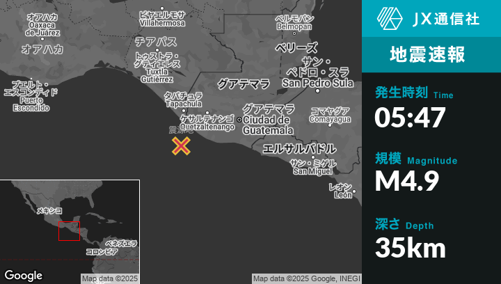 2月17日 05:47頃、グアテマラのChampericoから南西61kmの地点でM4.9の地震がありました。