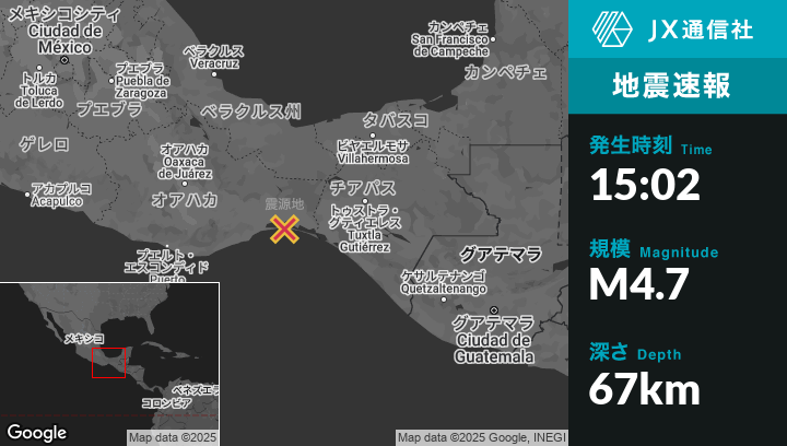 2月17日 15:02頃、メキシコのSan Dionisio del Marから東3kmの地点でM4.7の地震がありました。