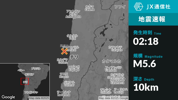 2月19日 02:18頃、チリのTaltalから南西111kmの地点でM5.6の地震がありました。