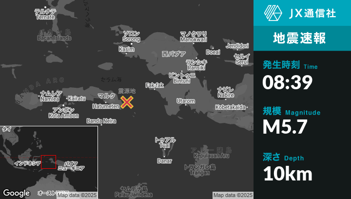 | 震源地 | インドネシアのFakfakから西南西148kmの地点 |