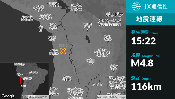 2月20日 15:22頃、チリのCamiñaから南南東44kmの地点でM4.8の地震がありました。