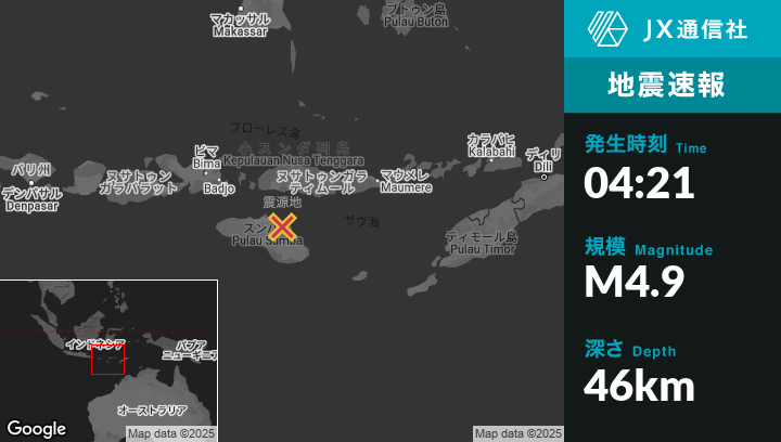 2月24日 04:21頃、インドネシアのWaingapuから北26kmの地点でM4.9の地震がありました。