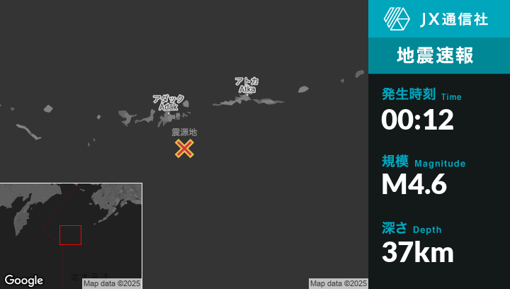 3月22日 00:12頃、アラスカのAdakから南南東75kmの地点でM4.6の地震がありました。