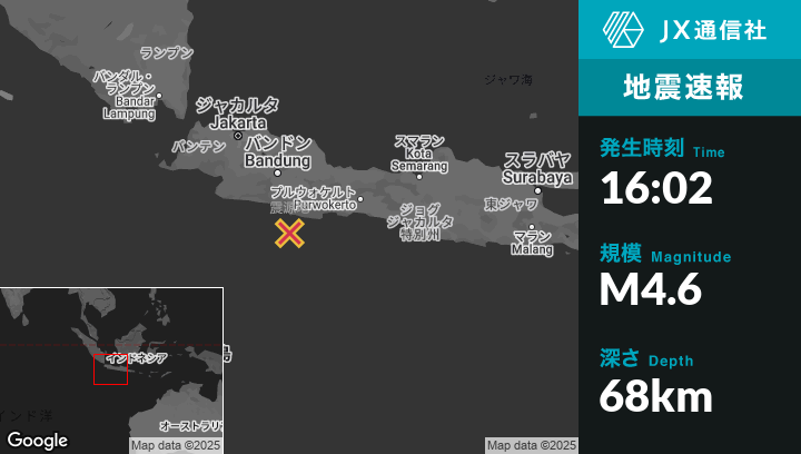 3月25日 16:02頃、インドネシアのSingaparnaから南南西76kmの地点でM4.6の地震がありました。