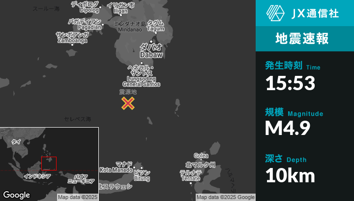 | 震源地 | フィリピンのSaranganiから南西145kmの地点 |