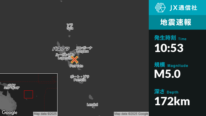 3月28日 10:53頃、バヌアツのLakatoroから東北東54kmの地点でM5.0の地震がありました。