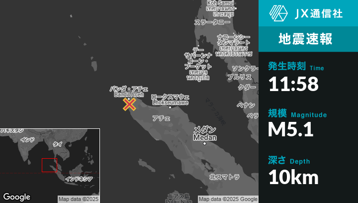 | 震源地 | インドネシアのBanda Acehから南12kmの地点 |