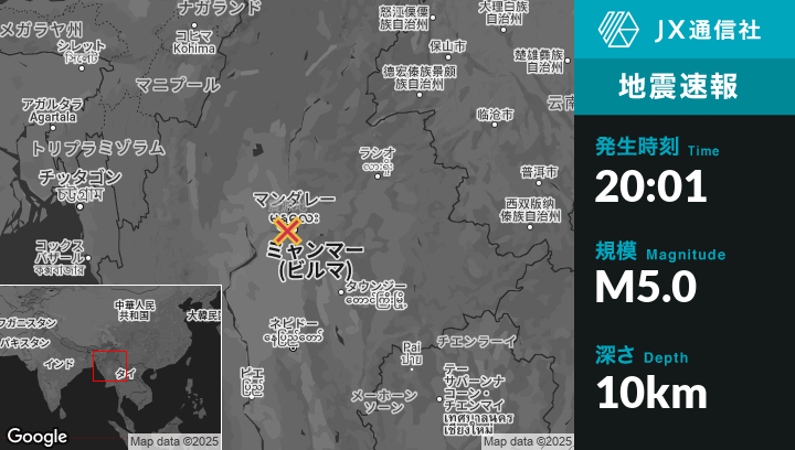 | 震源地 | ビルマ(ミャンマー)のMandalayから西北西15kmの地点 |