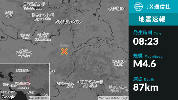 4月02日 08:23頃、アフガニスタンのJurmから南南西37kmの地点でM4.6の地震がありました。