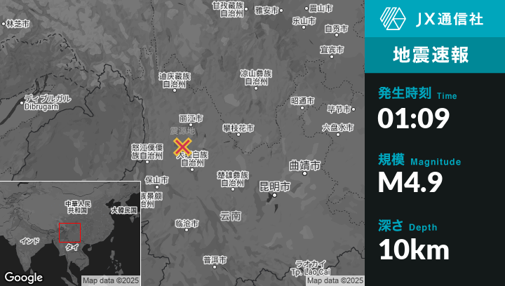 4月24日 01:09頃、中国のJinhuaから南21kmの地点でM4.9の地震がありました。