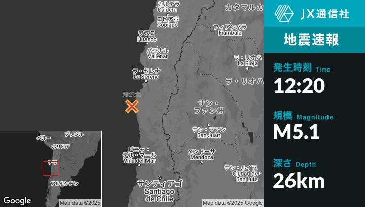 4月24日 12:20頃、チリのOvalleから西南西66kmの地点でM5.1の地震がありました。