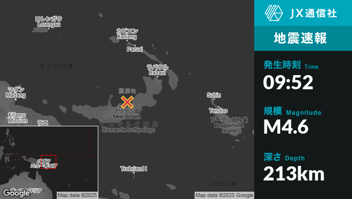 4月25日 09:52頃、パプアニューギニアのKimbeから東北東82kmの地点でM4.6の地震がありました。