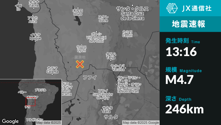 4月25日 13:16頃、ボリビアのAtochaから南西111kmの地点でM4.7の地震がありました。