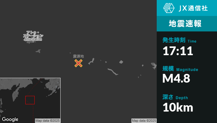 4月25日 17:11頃、アラスカのAttu Stationから東南東245kmの地点でM4.8の地震がありました。