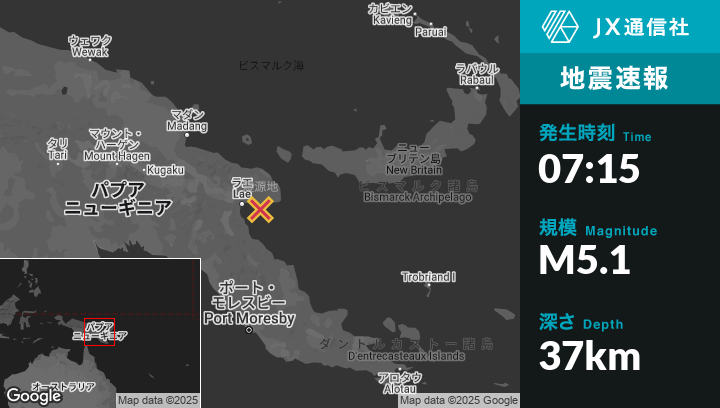 | 震源地 | パプアニューギニアのLaeから東43kmの地点 |