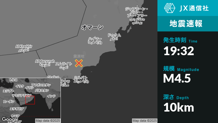 4月27日 19:32頃、オマーンのŞalālahから北東171kmの地点でM4.5の地震がありました。
