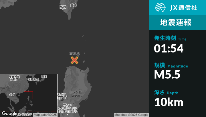 4月28日 01:54頃、フィリピンのNamuacから北58kmの地点でM5.5の地震がありました。