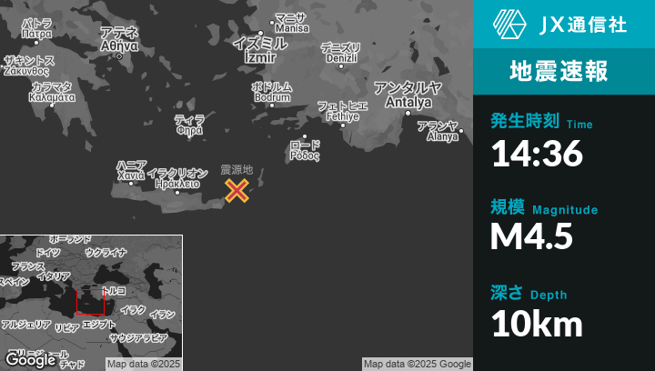 4月30日 14:36頃、ギリシャのFryから西北西33kmの地点でM4.5の地震がありました。