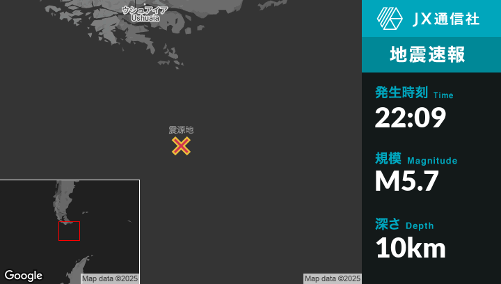 5月02日 22:09頃、アルゼンチンのUshuaiaから南南東279kmの地点でM5.7の地震がありました。
