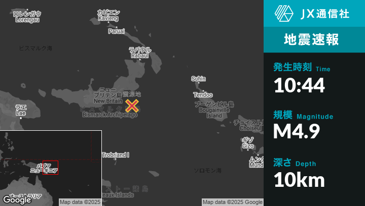 5月03日 10:44頃、パプアニューギニアのKimbeから東南東192kmの地点でM4.9の地震がありました。