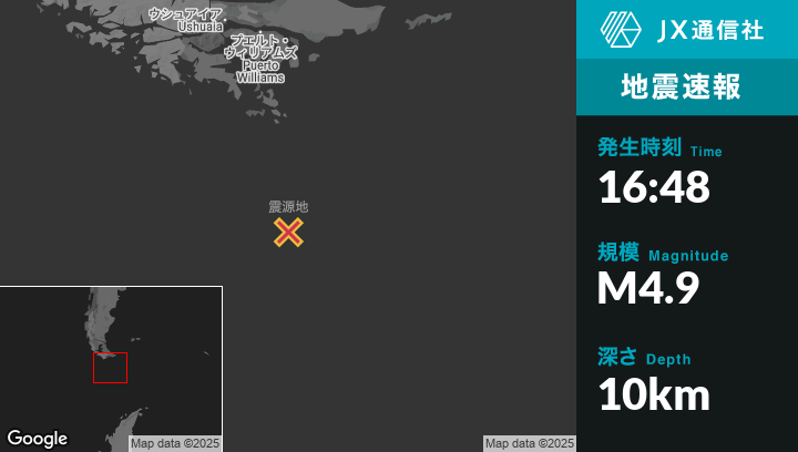 5月03日 16:48頃、アルゼンチンのUshuaiaから南南東264kmの地点でM4.9の地震がありました。
