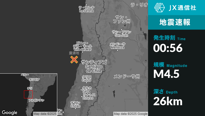 5月05日 00:56頃、チリのCartagenaから西北西58kmの地点でM4.5の地震がありました。