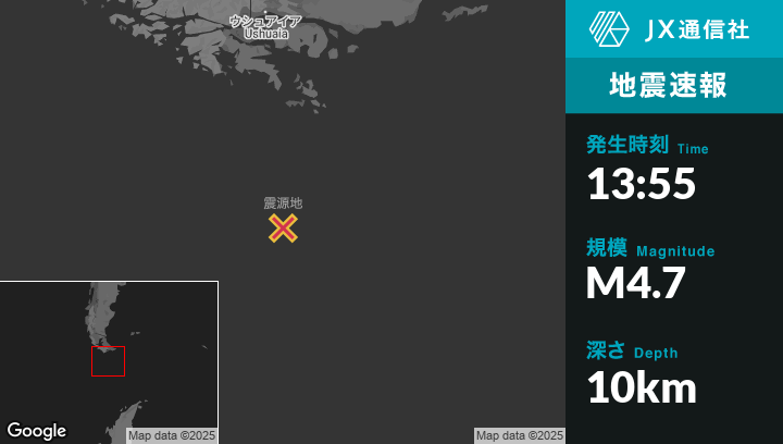 5月05日 13:55頃、アルゼンチンのUshuaiaから南263kmの地点でM4.7の地震がありました。