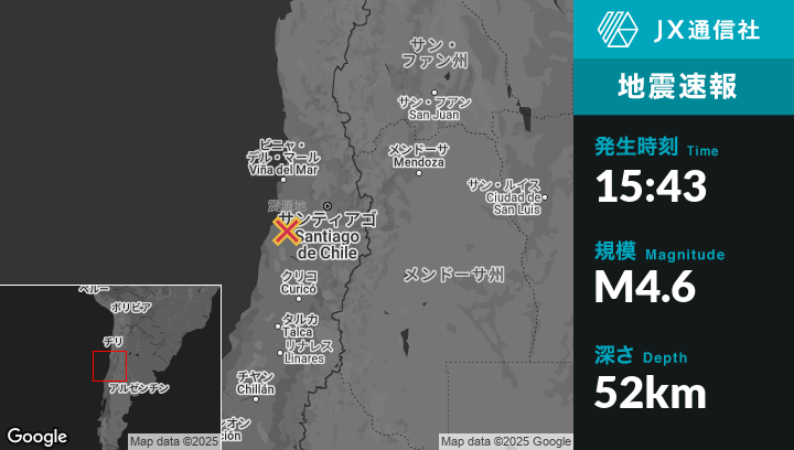 5月11日 15:43頃、チリのSan Antonioから南東22kmの地点でM4.6の地震がありました。