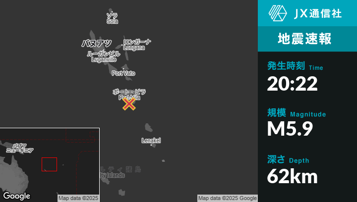 5月11日 20:22頃、バヌアツのPort-Vilaから北北西7kmの地点でM5.9の地震がありました。