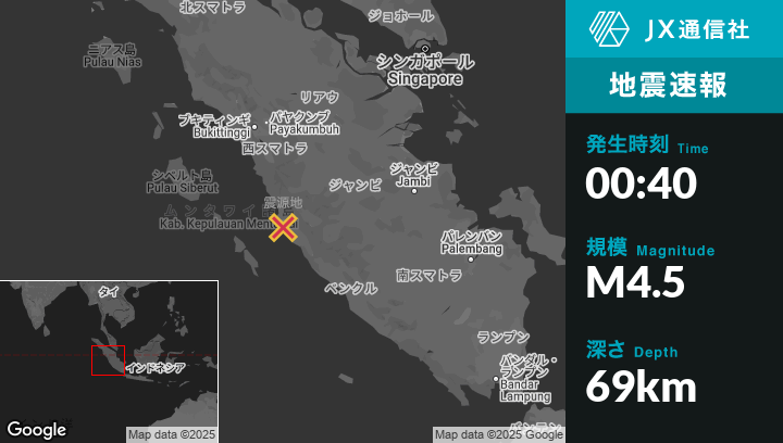 | 震源地 | インドネシアのSungai Penuhから西南西51kmの地点 |